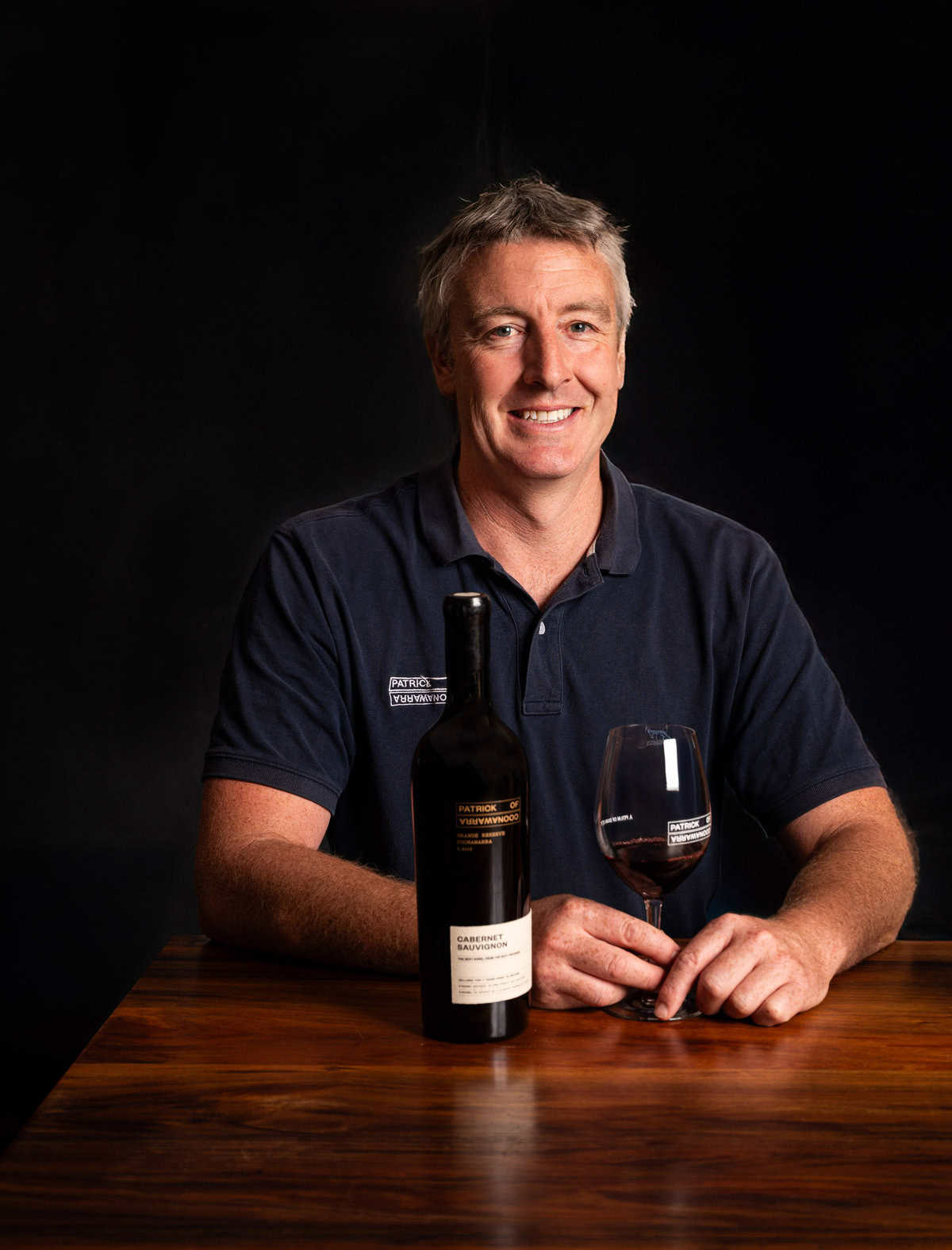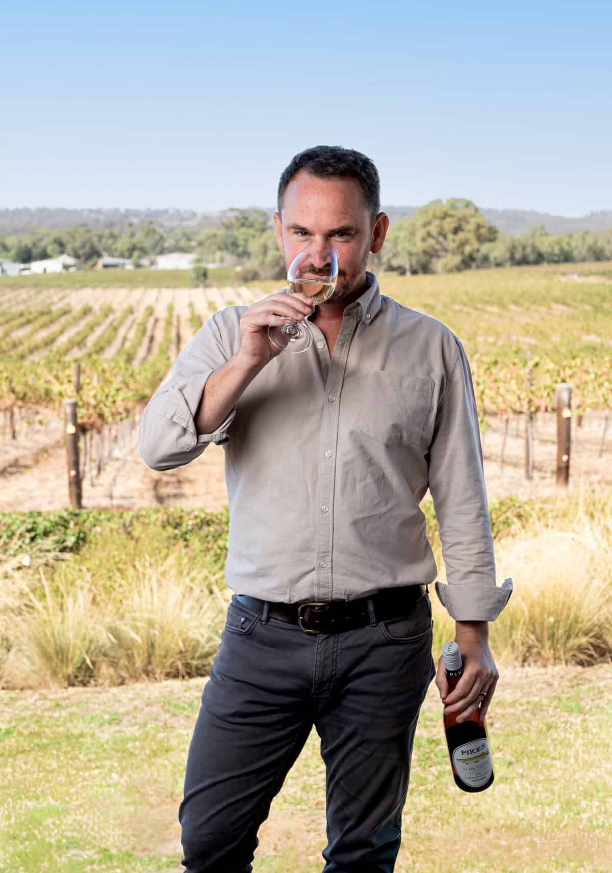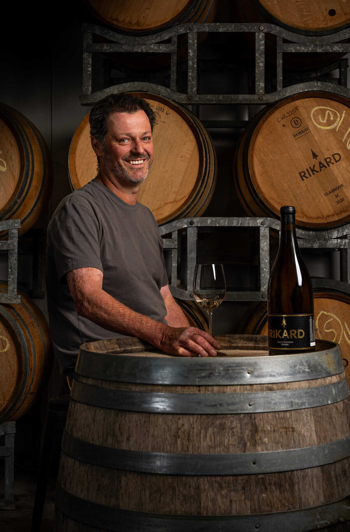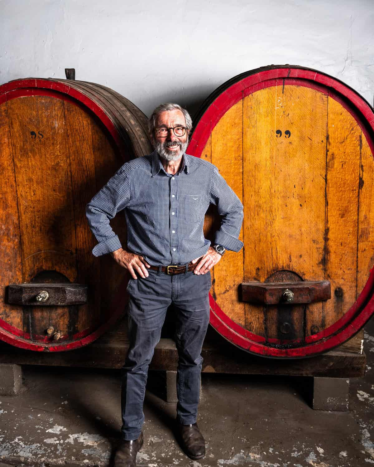 A man in a blue shirt and shorts holding a glass of red wine, standing in front of oak barrels in a wine cellar.