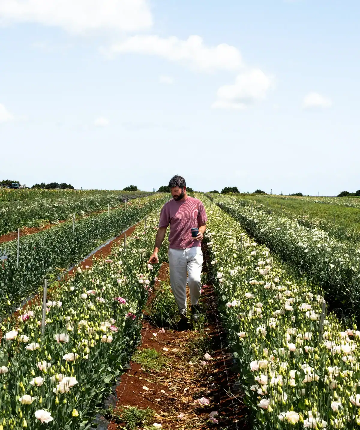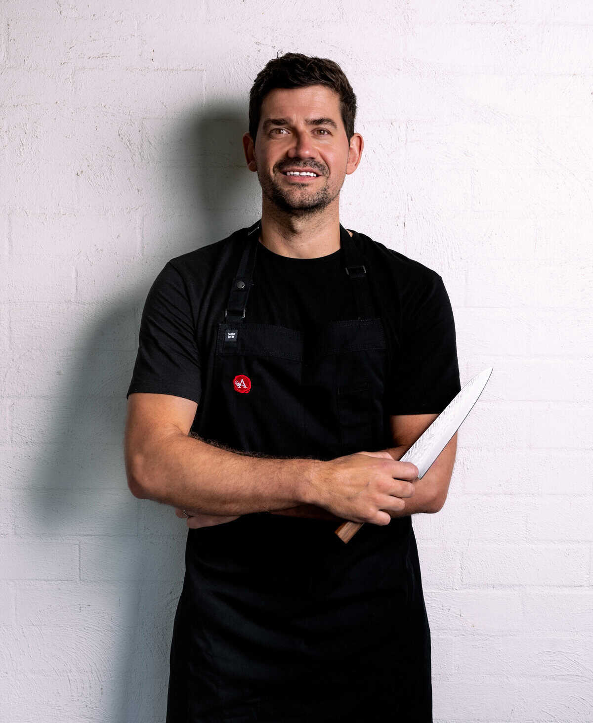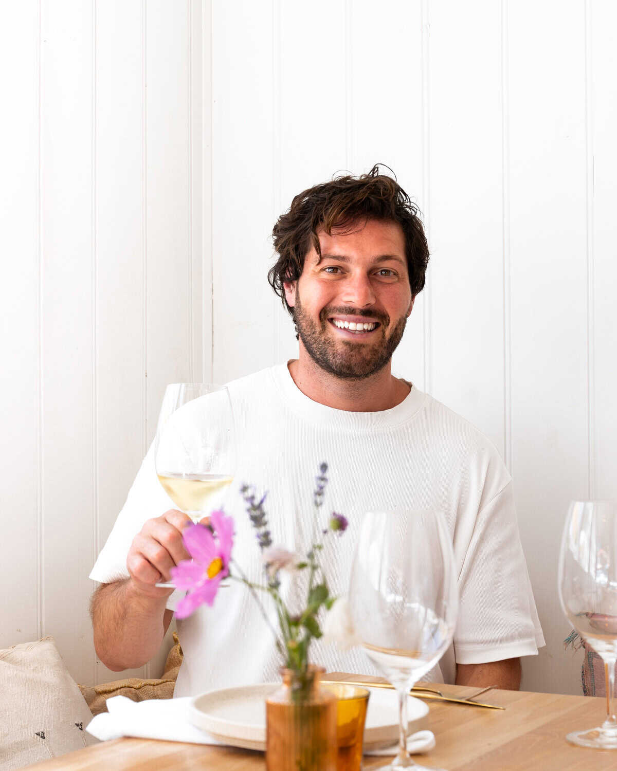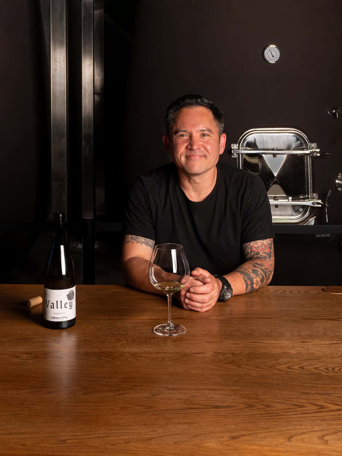 A man in a blue shirt and shorts holding a glass of red wine, standing in front of oak barrels in a wine cellar.